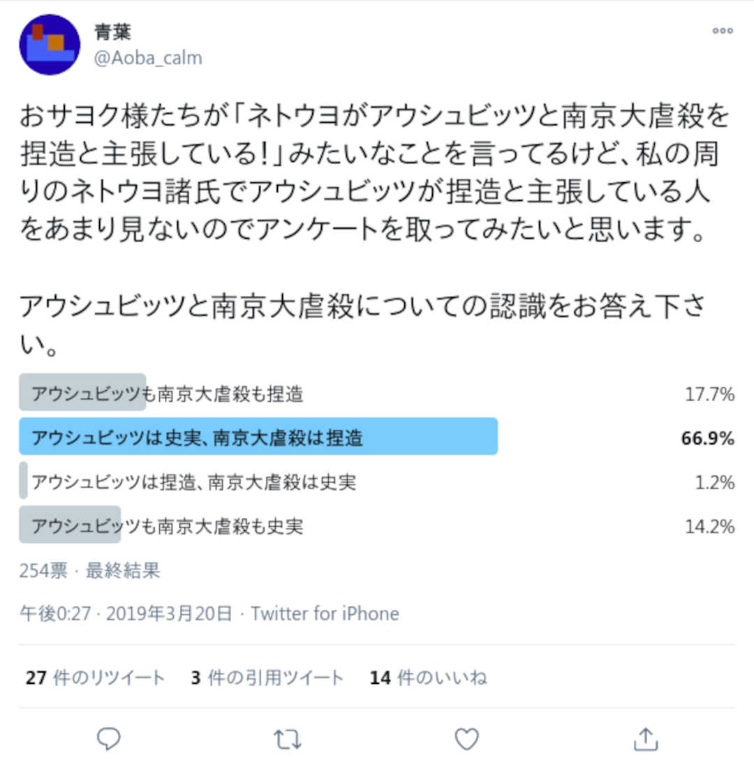 おサヨク様たちが「ネトウヨがアウシュビッツと南京大虐殺を捏造と主張している!」みたいなことを言ってるけど、私の周りのネトウヨ諸氏でアウシュビッツが捏造と主張している人をあまり見ないのでアンケートを取ってみたいと思います。